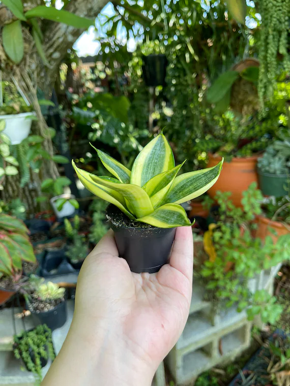 The Sansevieria trifasciata ‘Golden Hahnii’, also known as the Golden Bird’s Nest Snake Plant, is a dwarf variety of Snake Plant that grows horizontally, reaching a height of 6-8 inches and a spread of 8-12 inches. This slow-growing plant is a mutation of the more commonly known ‘Hahnii’.