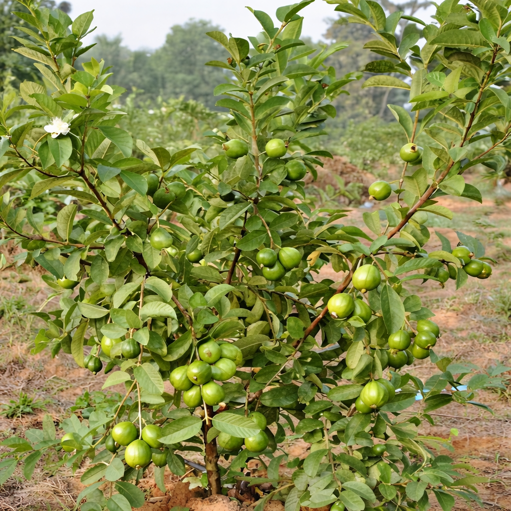 The Guava plant (Psidium guajava) is a small, tropical tree known for its aromatic, sweet, and tangy fruit. The tree produces round or pear-shaped fruits with a green or yellow skin and pink or white flesh. Guava is rich in vitamins, especially Vitamin C, and is enjoyed fresh, in juices, jams, or as a flavoring in various dishes.