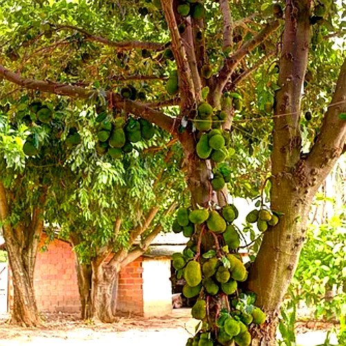 The jackfruit tree thrives in tropical climates with abundant rainfall and warm temperatures. It requires well-drained soil and grows best in areas with high humidity. The tree is drought-resistant once mature but is sensitive to frost. It is relatively easy to cultivate and grows well in areas where other fruit trees might not thrive. The tree can be grown from seeds or grafted, and it usually starts producing fruit within 3-4 years if grown from grafts.